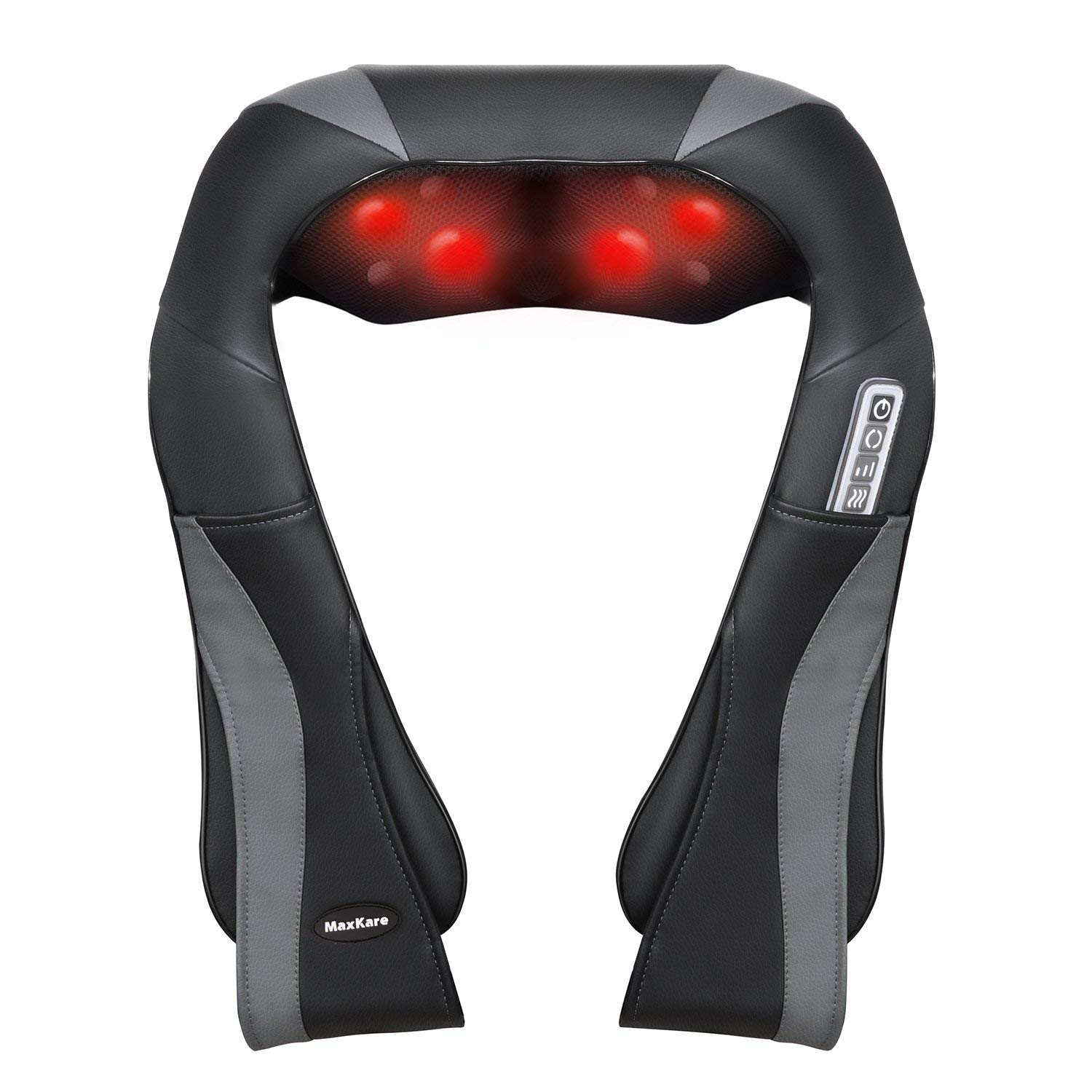MaxKare’s design of massager is the most commonly seen. It’s simple but very effective, with 4 large rotating massage heads that change direction every minute, a soothing heated option and a strap to easily attach to a chair or car headrest.